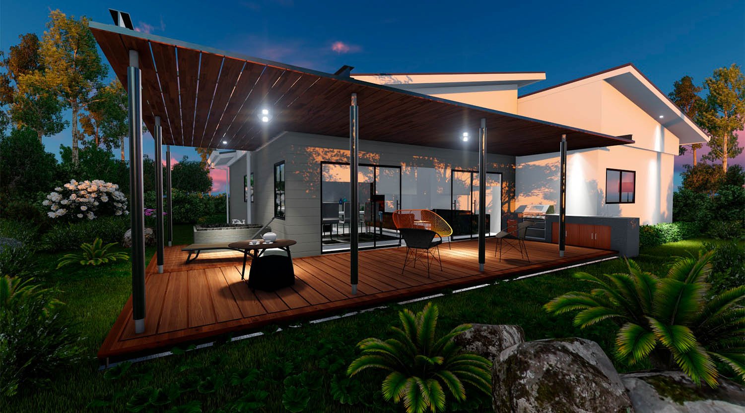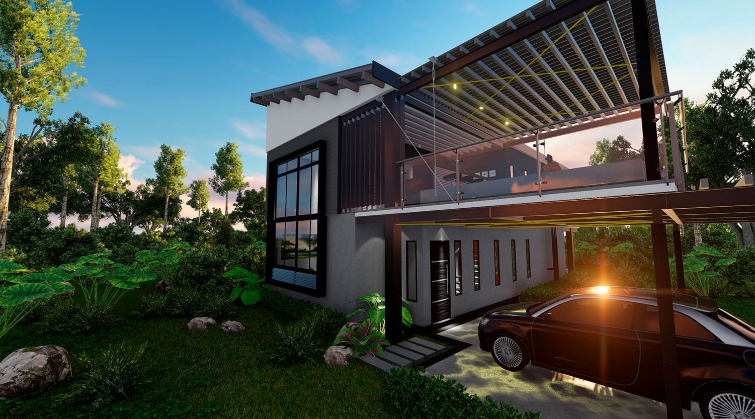 Área Social, Dormitorio principal con walking closet y baño, Dormitorio secundario, 1 baño, Área de lavado, Terraza y Area BBQ, Terraza con Jacuzzi, Área de Jardín, Cochera con pérgola para dos carros